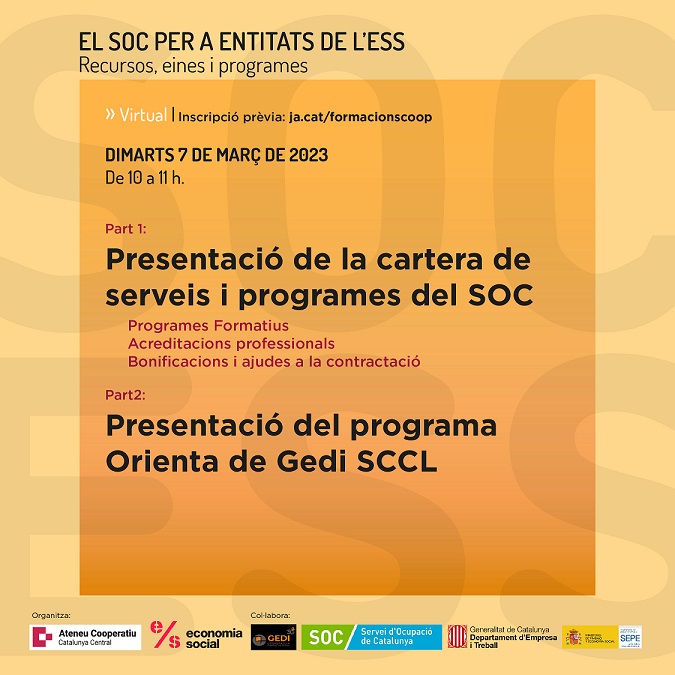 Sessió de presentació dels diferents programes del SOC que es poden acollir empreses cooperatives i entitats de l'Economia Social i presentació del programa específic de l'Orienta que gestiona Gedi i que s'ubica a la mateixa seu que l'Ateneu Cooperatiu de la Catalunya Central