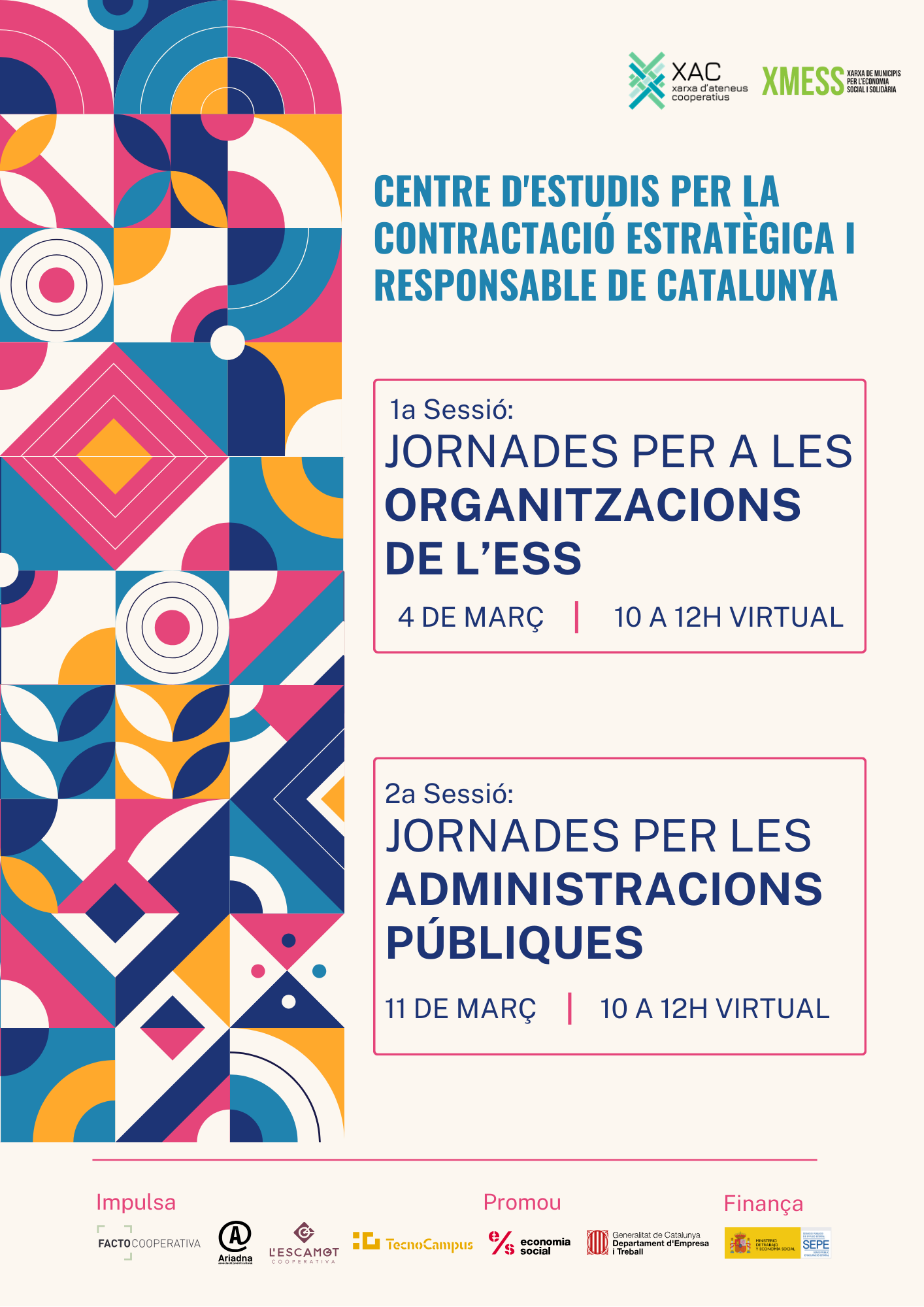 Jornades en línia sobre contractació pública estratègica i responsable organitzades pel Centre d'Estudis per l'Impuls de la Contractació Pública Estratègica i Responsable, la Xarxa d'Ateneus Cooperatius (XAC) i la Xarxa de Municipis per l'Economia Social i Solidària (XMESS). L'objectiu de les jornades és impulsar la contractació pública com una eina de transformació econòmica i social, especialment per a les empreses de l'ESS.